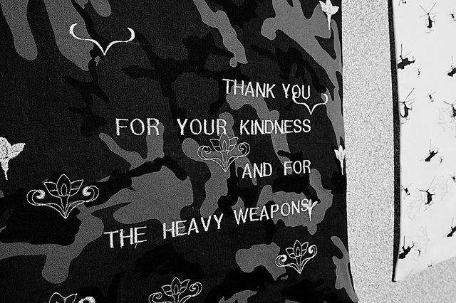 Cette approche se retrouve chez Cristina Picco, qui se confronte à la violence en brodant des représentations d’équipement militaire. Sur un carré de tissu, elle festonne par exemple des anges aux côtés d’hélicoptères de combat. Son travail véhicule avec ironie la violence d’une réalité militarisée, amplifiée par une surveillance démesurée. Une réalité qu’elle choisit d’inscrire sur une surface organique et élémentaire. Peut-être est-ce précisément parce que cette violence est omniprésente, consommée frénétiquement, qu’elle pourrait aussi être délicatement brodée sur un t-shirt, au point de susciter l’envie de l’« ajouter au panier ».