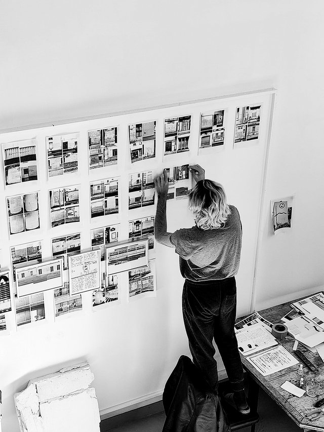 Le travail que l’artiste mène actuellement à Paris, dans le cadre d’une résidence de recherche et de création va dans ce sens. Son projet walls/ origins/ replacements s’intéresse à l’histoire du graffiti, non seulement à travers la technique de l’utilisation de la peinture en spray, mais aussi à propos de l’importance de l’espace public en tant que terrain de jeu. Ses recherches le conduisent à s’intéresser à Gérard Zlotykamien (surnommé Zloty), considéré comme le pionnier de l’art urbain en France, le premier à avoir utilisé la peinture en spray sur les murs, dès 1963. Par un concours de hasards heureux, cette personnalité a émergé plusieurs fois en l’espace de quelques semaines cet automne : l’octogénaire expose au Palais de Tokyo (dans le cadre de Lasco Project), la Galerie Mathgoth lui consacre une rétrospective et une monographie paraît. Cela donne à Julien Hübsch l’occasion de rencontrer ce « grand-père mignon qui sait très bien ce qu’il vaut » et d’orienter son travail plus précisément autour de cette figure. Il retrouve ainsi une quarantaine de lieux où Zloty avait peint ses Éphémères. Suit alors un long processus créatif de transformation. L’artiste photographie les murs, forcément repeints et où, plusieurs décennies après, plus rien ne laisse entrevoir les traces des graffitis. Il retravaille ces images numériquement, en leur appliquant systématiquement un filtre noir et blanc aux contrastes marqués et au fort grain, inspiré des photographies de Daido Moriyama. Finalement, il les imprime sur des feuilles jaunes, créant ainsi environ 80 fiches entre documentation et expérimentation.