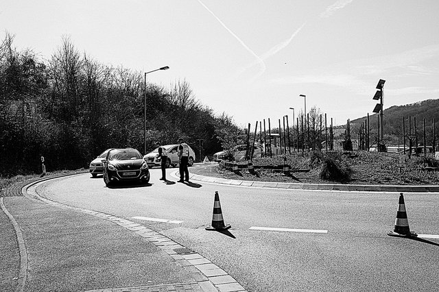 Doch seit vergangenem Montag verbindet die Brücke nicht, sondern sie trennt. In einem Kreisverkehr am deutschen Moselufer haben Bundespolizisten die Einfahrt nach Perl mit Hütchen versperrt. Drei Polizisten kontrollieren jedes Auto: Einer hat ein Stück Kreide in der Hand, eine Polizistin bewacht die Leitkegel und einer redet. Wer die deutsche Staatsbürgerschaft oder einen Passierschein besitzt oder einen triftigen Grund anführen kann, erhält ein Nicken. Die Polizistin entfernt die drei Leitkegel, das Auto darf weiterfahren. Wer nicht zu dieser privilegierten Gruppe gehört, erfährt dies durch ein Kopfschütteln. Dann markiert der Polizist mit der Kreide das linke Vorderrad des Fahrzeugs, der Fahrer muss im Kreisverkehr die Ausfahrt Richtung Schengen oder Frankreich nehmen.